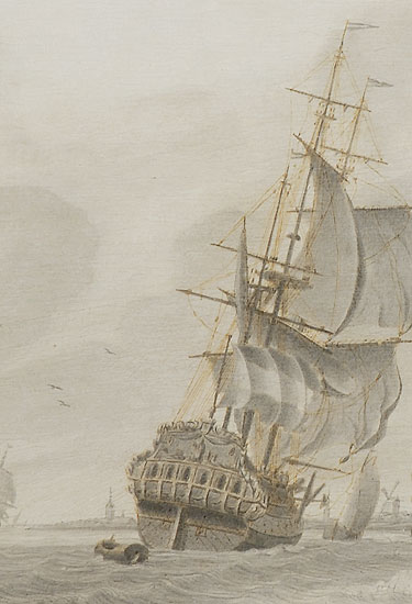 Het grote driemastschip in het midden is een koopvaarder, misschien een “retourschip” dat dienst onderhield tussen de Republiek en Batavia. Het schip rechts is ook een vrachtschip, een fluit. Dit type schip met zijn bolle romp en smalle dek ontstond in de zeventiende eeuw; het had een groot laadoppervlak en kon worden bevaren met een kleine bemanning.